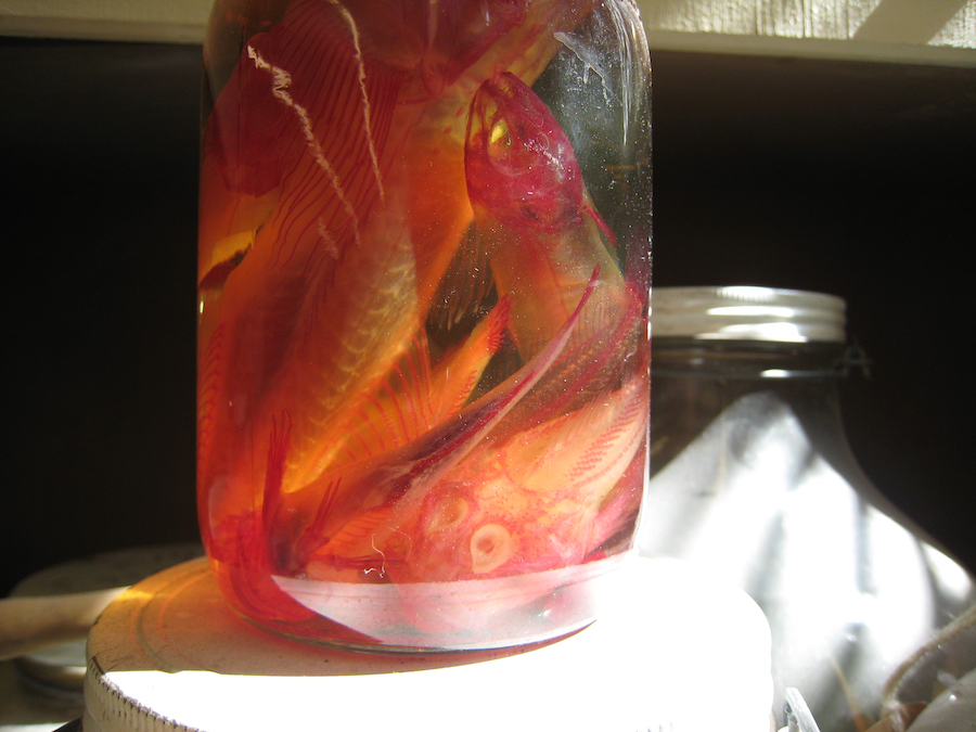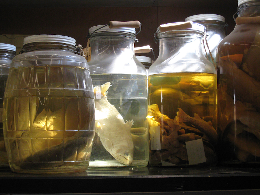 The fish you see in jars are generally preserved in alcohol. This allows the entire specimen to be preserved, including the internal organs and skeleton. This is useful for researchers as it allows them to see every part on the fish. Alcohol can degrade colour pigment over time, which results in the specimens fading from their natural appearance.